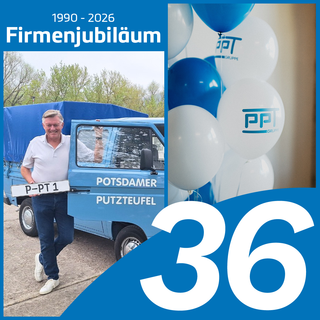 Am 27. April 1990 begann unsere Erfolgsgeschichte – heute können wir voller Stolz auf mittlerweile 36 Jahre Firmengeschichte zurückblicken. Als professionelle Reinigungsfirma stehen wir seit Tag 1 für Sauberkeit, Qualität und Vertrauen. Ob Reinigungsdienstleistungen, Grünanlagenpflege, Winterdienst oder Glas- und Sonderreinigungen – die PPT Gruppe ist stets ein verlässlicher Partner.